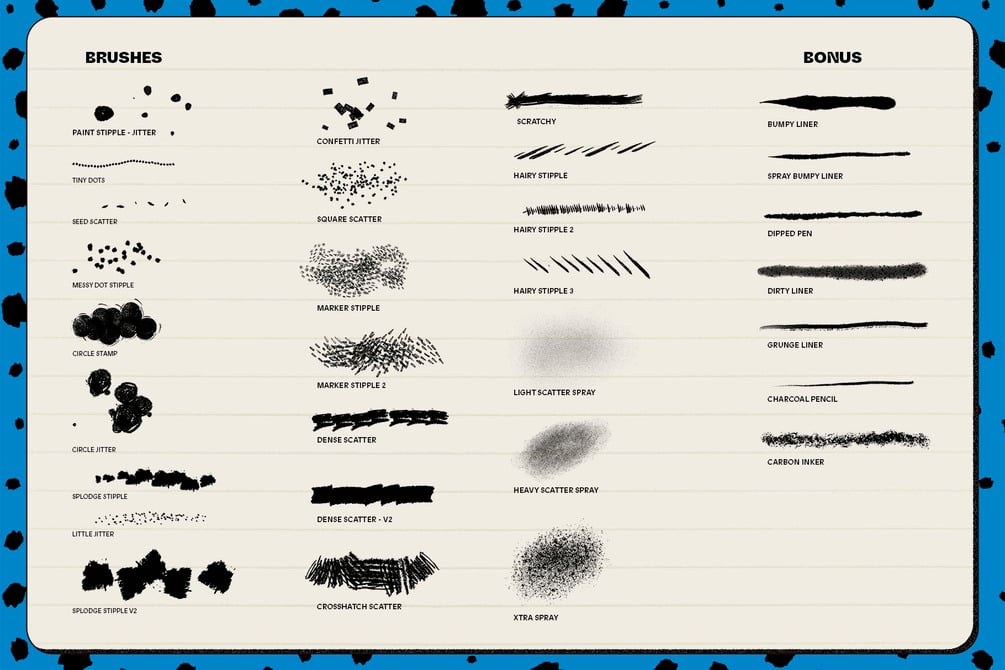 • Includes brushes for creating dust, confetti, grunge, dots and more..